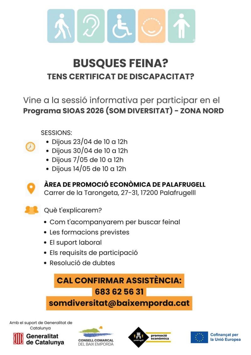 17/04/2026 Inici del Programa SOM DIVERSITAT (SIOAS 2026) a Palafrugell Una aposta per la inclusió laboral de persones amb discapacitat Es realitzaran 4 sessions informatives per a les persones interessades els dies 23, 30 d’abril, 7 i 14 de maig a l’Àrea de Promoció Econòmica de Palafrugell, al carrer Tarongeta, 27. Veure cartell +